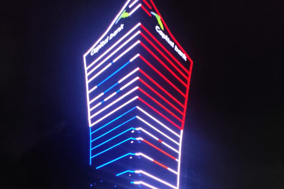 Ahora, con la instalación de iluminación lista antes de la celebración nacional, el Capital Bank ofrece un impresionante espectáculo de luz, haciéndolo visible incluso desde lejos.